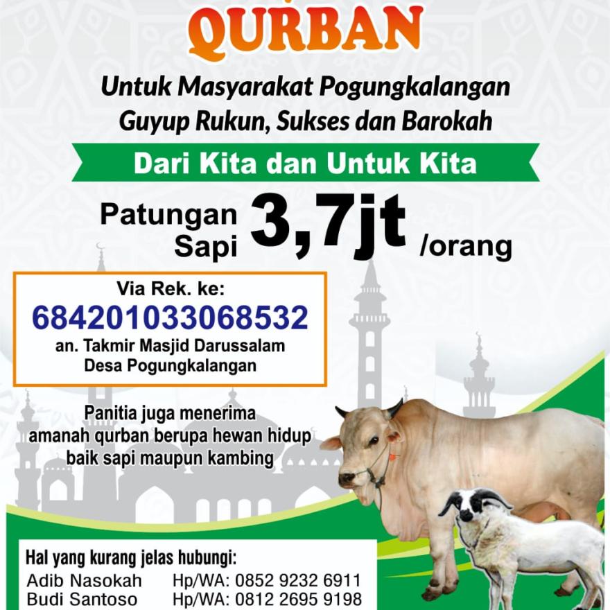 Dalam musyawarah disepakati pembentukan Panitia Qurban Masjid Darussalam Desa Pogungkalangan. Disepakati pula iuran/patungan hewan qurban berupa sapi sebesar @ Rp 3.700.000,00. Pemotongan hewan qurban akan dilaksanakan tanggal 10 Dzulhijjah 1447 H. Panitia juga menerima hewan qurban yaitu sapi maupun kambing dengan menambah biaya pengolahan.